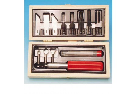 Coffret en bois contenant : un couteau N°5 avec un assortiment de lames et de gouges....