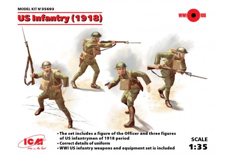 L'ensemble comprend 33+104 pièces pour l'assemblage de 4 figurines d'infanterie américaine d'époque 1918....