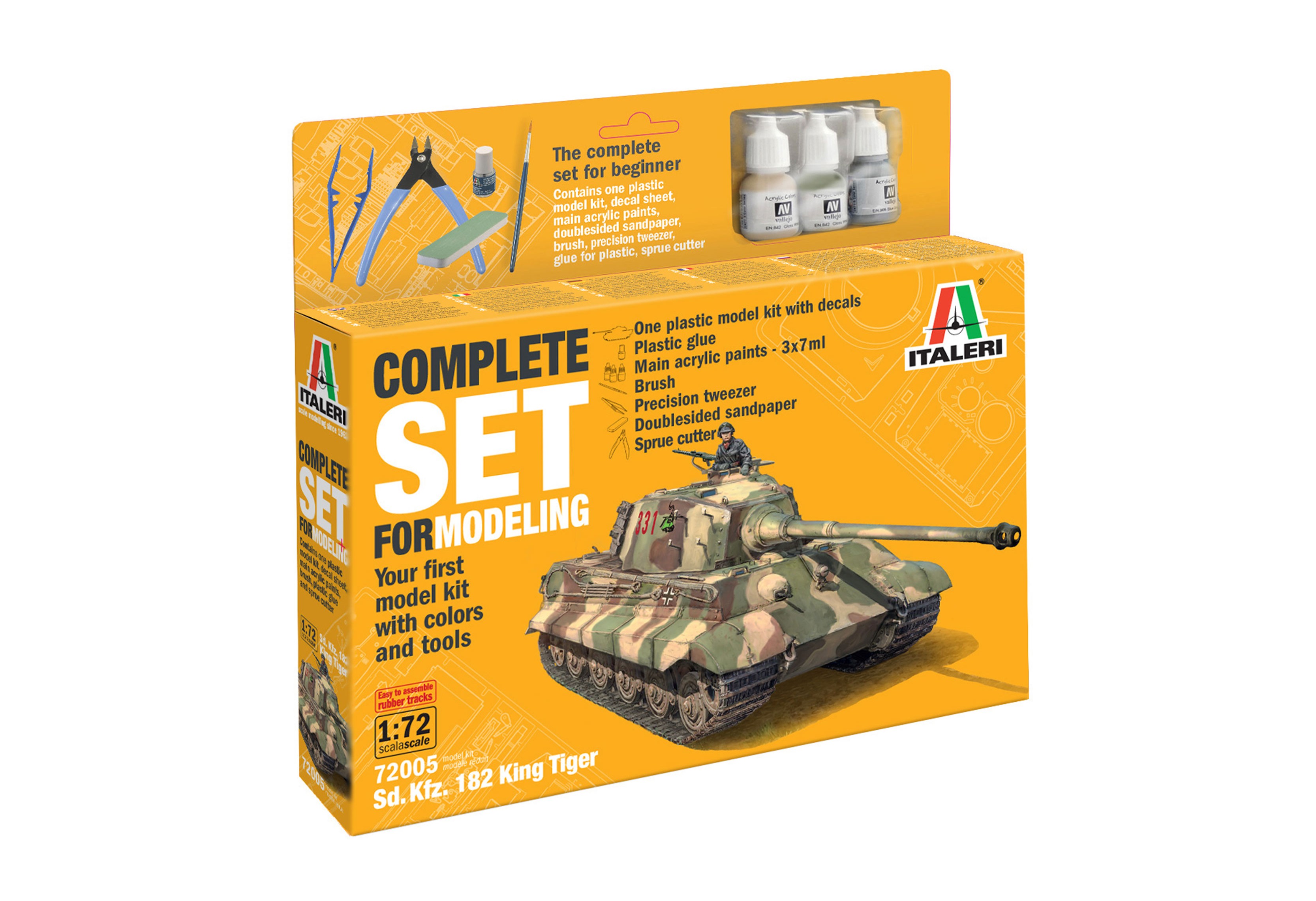 Contient : Un kit de maquette en plastique avec décalcomanies - Colle plastique - 3 couleurs acryliques principales (7 ml) - Pinceau - Pince de précision - Lime abrasive double - Cutter