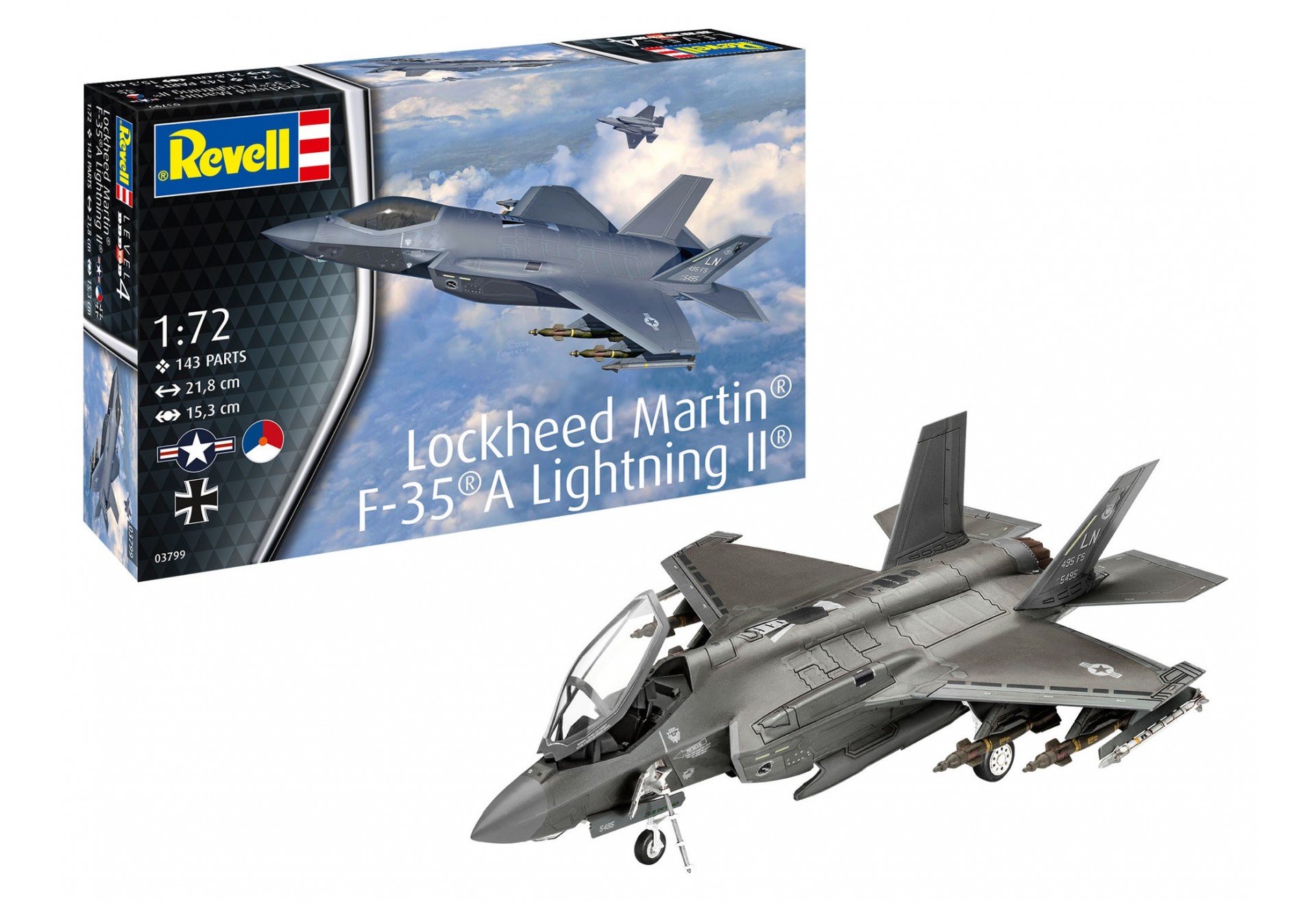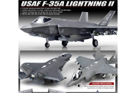 Moule complet de 2013. Maquette du F-35A finement reproduite avec cockpit détaillé, train d'atterrissage réaliste et précis, pilote inclus. Baies d'armement et de train pouvant être montées ouvertes ou fermées. Nombreux missiles inclus : AIM-9X, AIM-120C,...