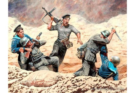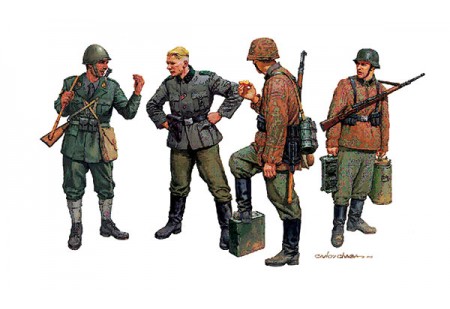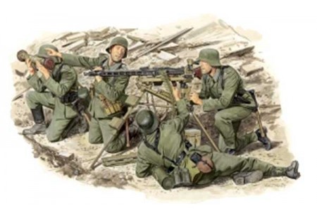 Ce kit de maquette de haute qualité à l'échelle 1:35 comprend cinq figurines détaillées de soldats allemands endurant l'hiver sur le front de l'Est pendant la Seconde Guerre mondiale.