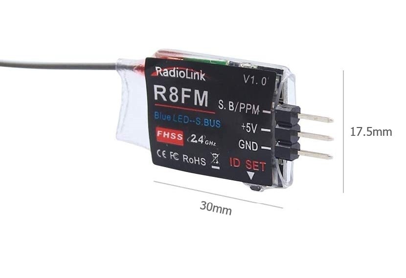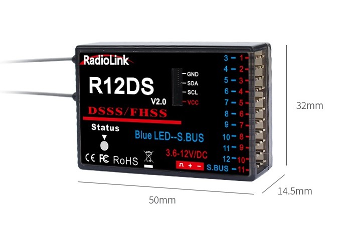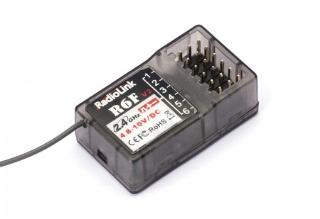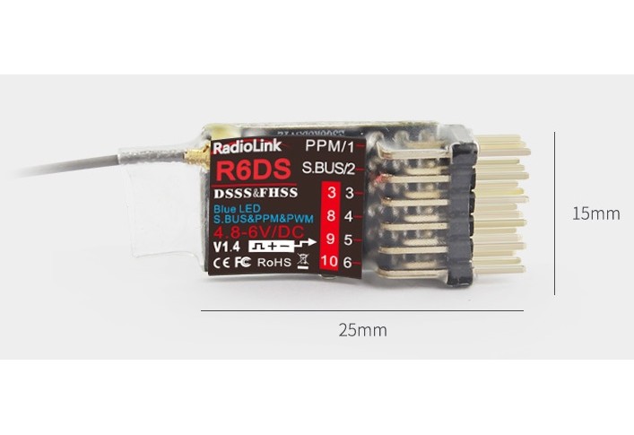 e R6DS peut avoir les sorties en PPM, PWM et S-BUS. Il utilise la technologie de saut de frauence DSSS et FHSS et dispose de la télémétrie sur la puissance du signel. Il est compatible avec les émetteurs Radiolink AT10II/AT10/AT9S Pro/AT9S/AT9