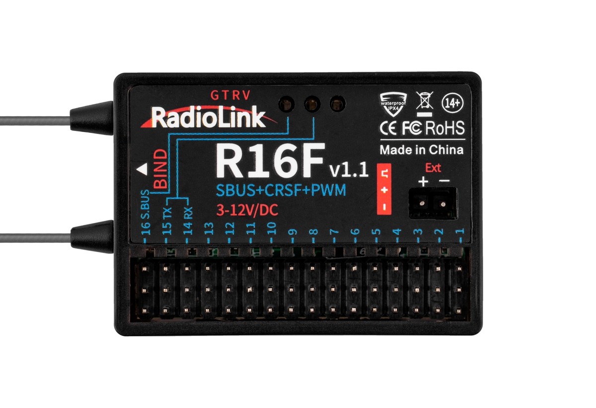 Radiolink R16F 2,4 GHz est un récepteur FHSS 16 canaux à saut de fréquence avec télémétrie compatible avec les émetteurs Radiolink T12D et T16D. Il offre quatre modes de fonctionnement :
