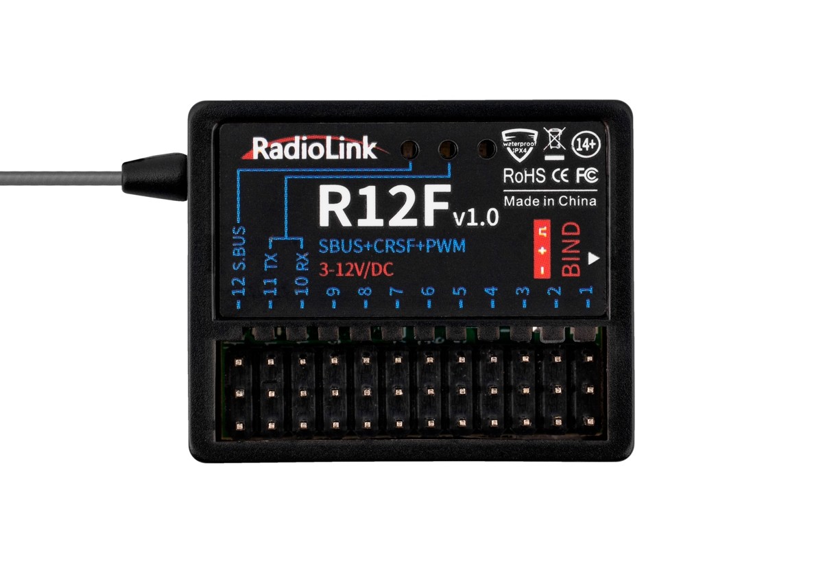 Le Radiolink R12F 2,4 GHz est un récepteur FHSS 12 canaux à saut de fréquence sans télémétrie, compatible avec les émetteurs Radiolink T12D et T16D. Il offre quatre modes de fonctionnement :