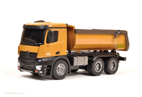 Réplique radiocommandée échelle 1/20 d’un camion benne de travaux publics. Réalisme absolu, y compris pour les fonctionnalités identiques à celles d’un vrai, avec des effets sonores en plus !