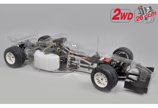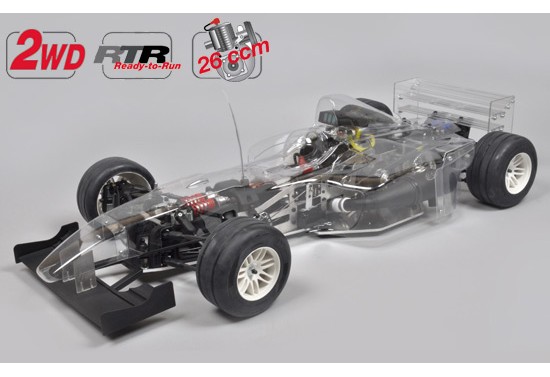 Formule 1 radiocommandée équipée d'un moteur 26cm3, avec une carrosserie transparente et prête à rouler.