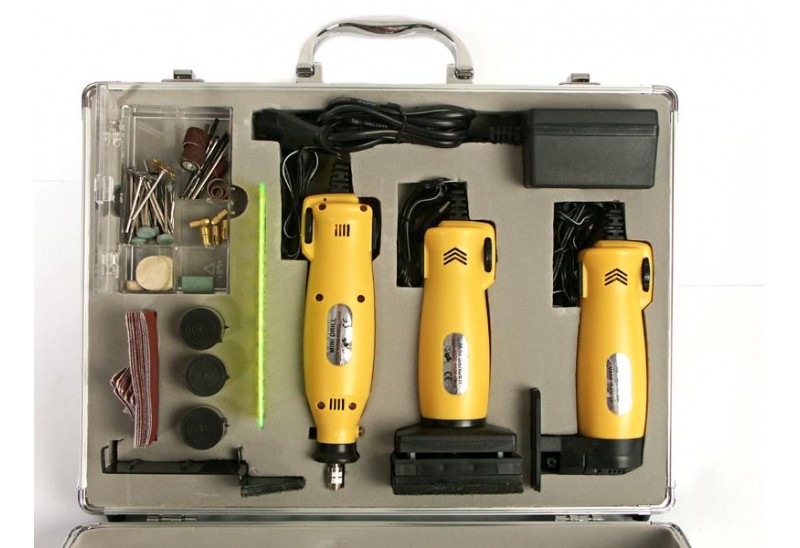 Mallette aluminium contenant une perceuse, une scie sauteuse, une ponceuse, un transformateur 12 volts ainsi qu'une multitude d'accessoiresn....