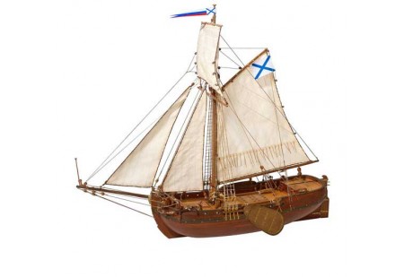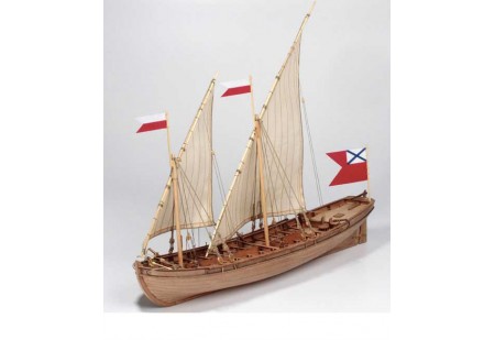 Reproduction d'un petit navire naviguant à la voile et à l'aviron sur les rivières, les lacs et en bordure de côte dans les années 1730.