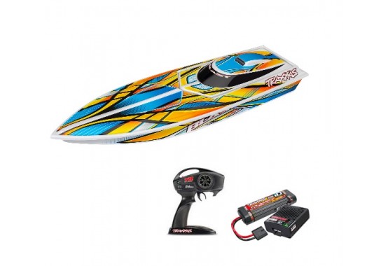 Racer Offshore RC, livré avec télécommande, accus et cordon de charge.