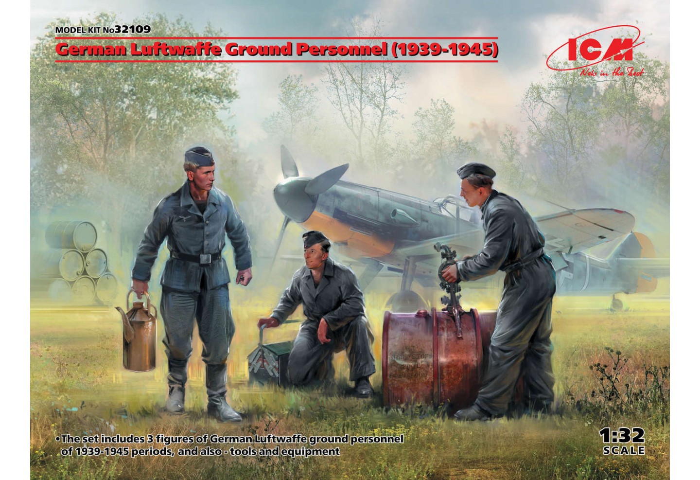 La boite comprend 3 figurines ( à assembler et à peindre) du personel au sol de la Luftwaffe durant la période 1939 1945
